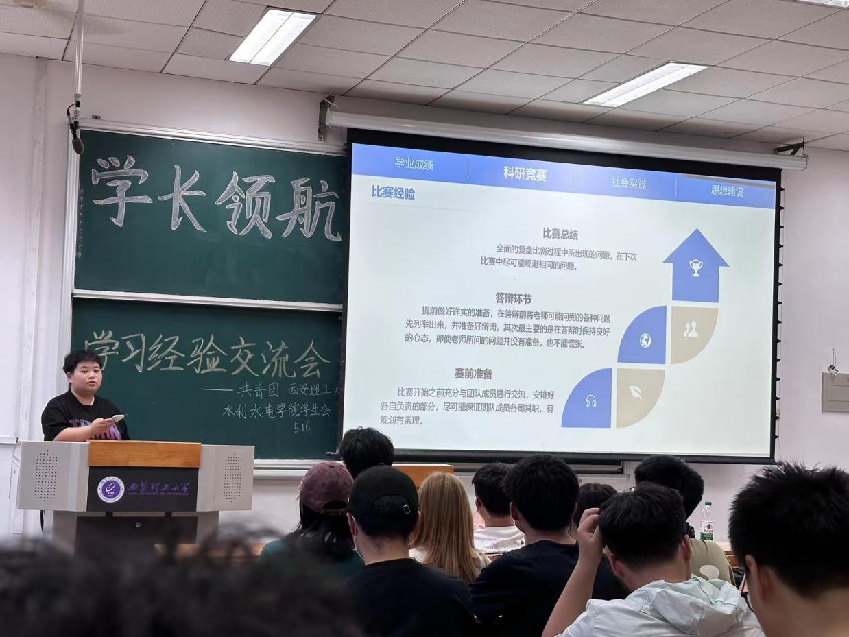 分享会上,连续三年加权平均分、智育成绩位列年级第一,现已推免至大连理工大学水工结构专业的水工201班班长庞绍筠,从学习时间管理、考试复习、科技竞赛等多个方面分享了自己的成长故事,鼓励学弟学妹们要脚踏实地,静下心,有规划地完成各项学习任务;曾获“水电学会奖学金”“优秀学生干部标兵”“尚善明德先进个人”等十余项荣誉称号的原学院学生会负责人韩佳鑫,重点为同学们分享了担任学生干部工作的收获与心得,并就如何处理好学习与学生工作分享了自己的经验,希望同学们在实践中不断提升自身综合能力;以2024年研究生入学考试400分的优异成绩考入我校研究生的赵洪德,回顾了自己上大一时的迷茫和困惑,分享了自己如何直面困难,挑战自我的经历,鼓励学弟学妹们直面困难,永不言弃,通过自己的努力实现自己的人生目标。交流环节,高年级同学耐心细致地回答了同学们在生活学习工作中困惑,提出了积极诚恳的意见建议。