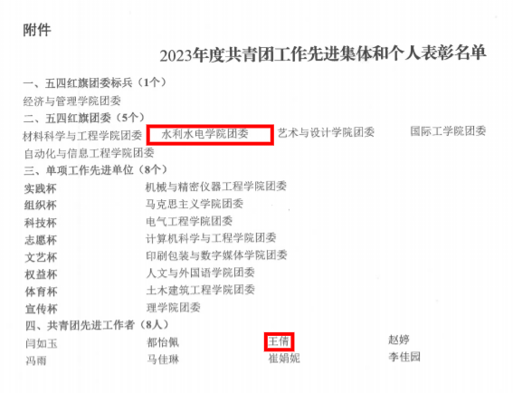 近日,共青团yl23455永利集团委员会印发《关于表彰2023年度先进集体和个人的决定》,我院团委荣获“2023年yl23455永利集团五四红旗团委”称号,学院团委书记王倩获“2023年yl23455永利集团共青团先进工作者”称号,水工201等五个团支部荣获“五四红旗团支部”,叶旭获“优秀共青团员标兵”、刘悦等91人获“优秀共青团员”,顾晓蕾等71人获“优秀共青团干部”。