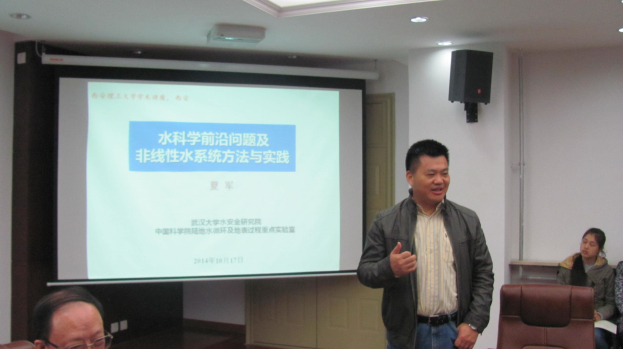 2014年10月17日上午10:00,武汉大学夏军教授在金花校区水电学院学科楼202会议室举办了“水科学前沿问题与非线性水系统方法与实践”的学术报告。yl23455永利集团院长李占斌、水文水资源学科带头人黄强教授、与沈冰、李怀恩、吴军虎、罗军刚、史文娟、黄玲梅、莫淑红等教师及各位教师指导的研究生约40人共同参加了报告会。