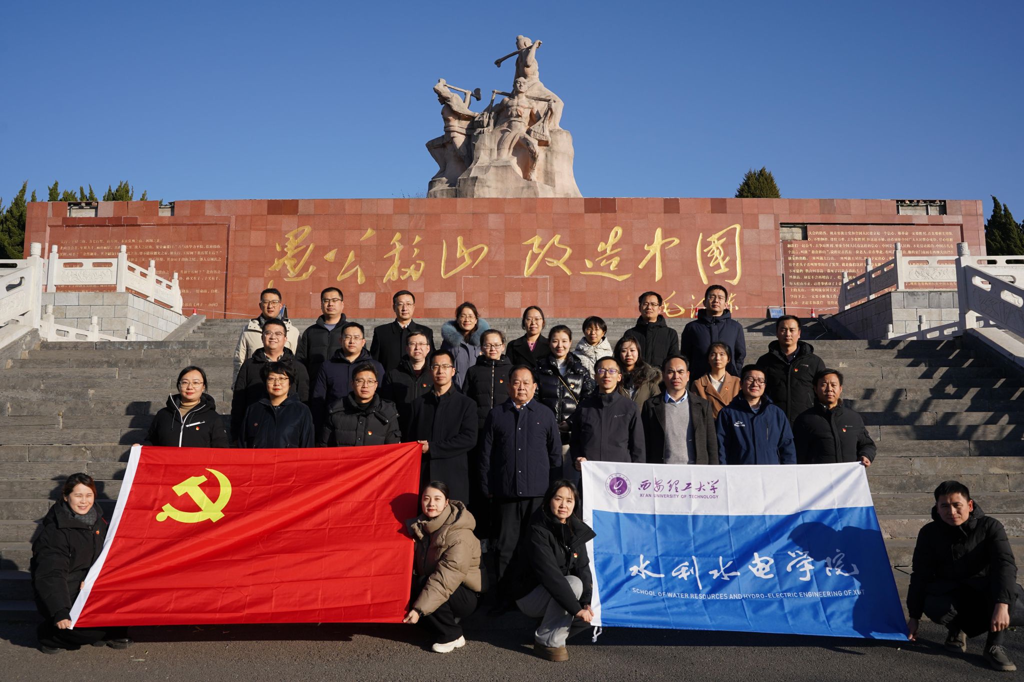在王屋山愚公移山雕像处,大家集体诵读《愚公移山》原文和毛泽东主席在党的七大会议上所作的《愚公移山》闭幕词。感悟共产党人坚强的意志、远大的志向和锲而不舍、脚踏实地、埋头苦干的精神。毛泽东主席“愚公移山,改造中国”题词,激发了大家“下定决心,不怕牺牲,排除万难,去争取胜利”豪情壮志。